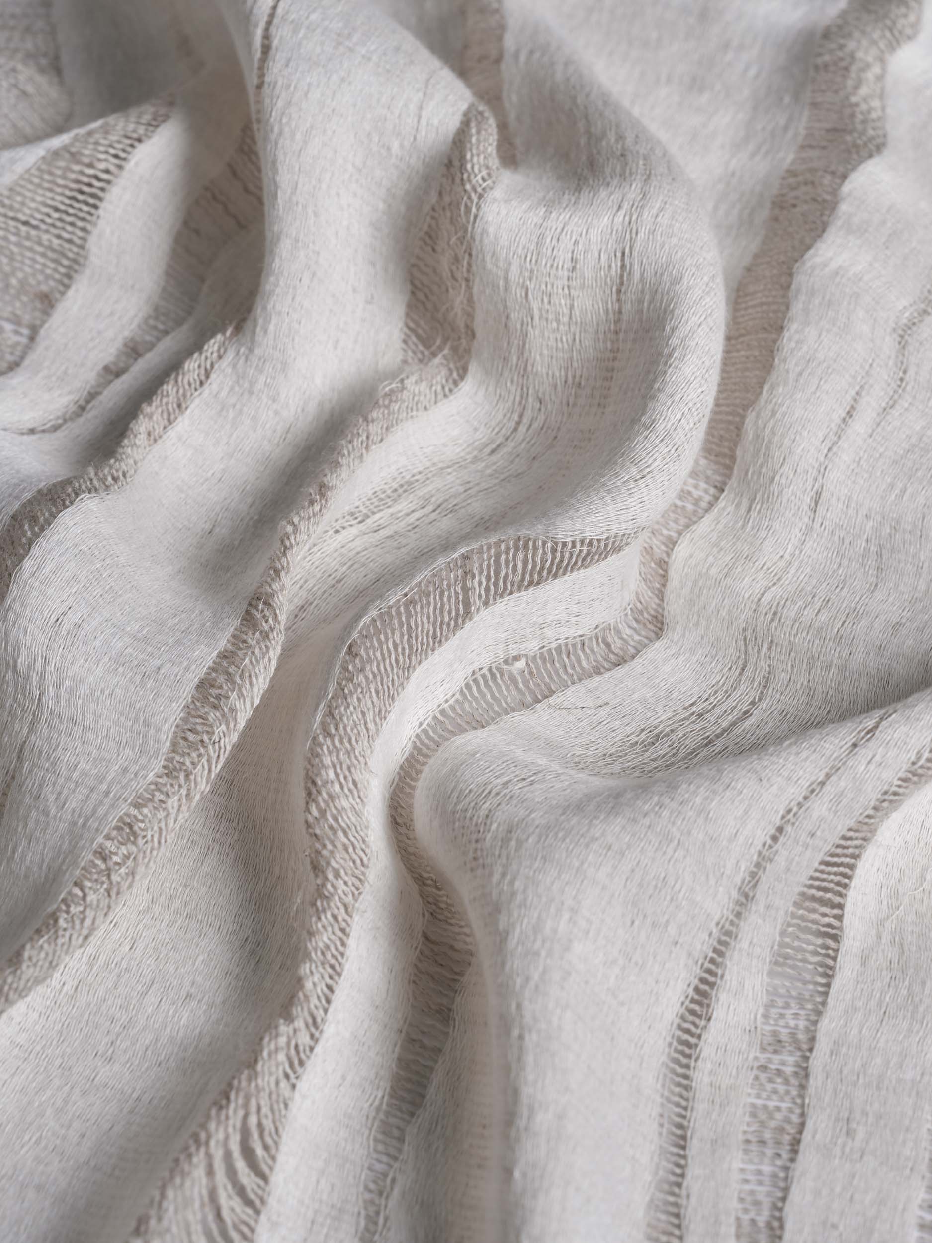 Il tessuto trasparente AURA incanta con le sue trasparenze irregolari, evocando l'aspetto di striature dipinte a mano. Una tecnica di tessitura speciale realizza questo effetto unico, combinando trame di lino molto fini con un ordito molto più spesso. In grande altezza e con due lati distinti, AURA offre opzioni di styling versatili, aggiungendo un tocco contemporaneo e naturale a qualsiasi ambiente.