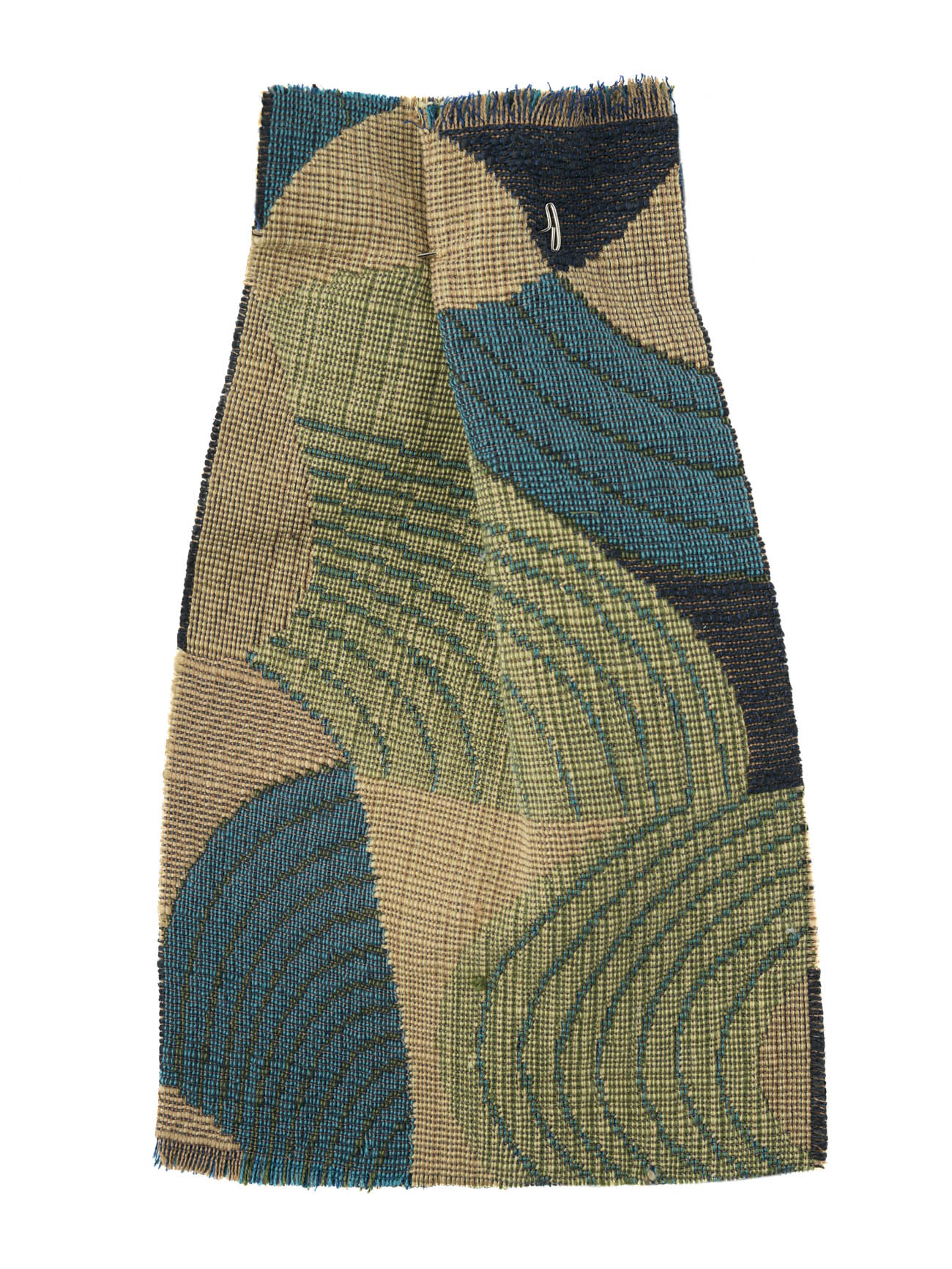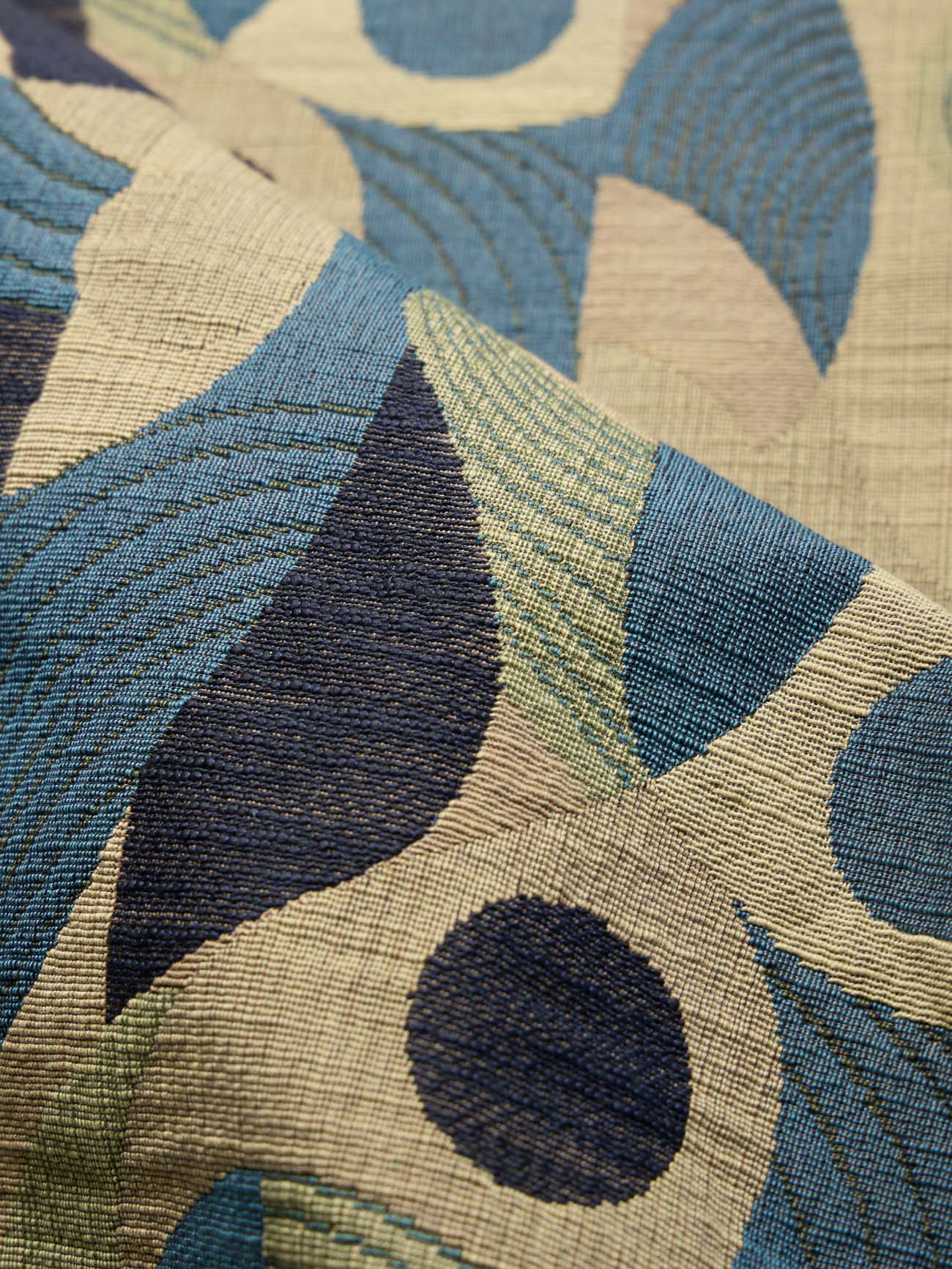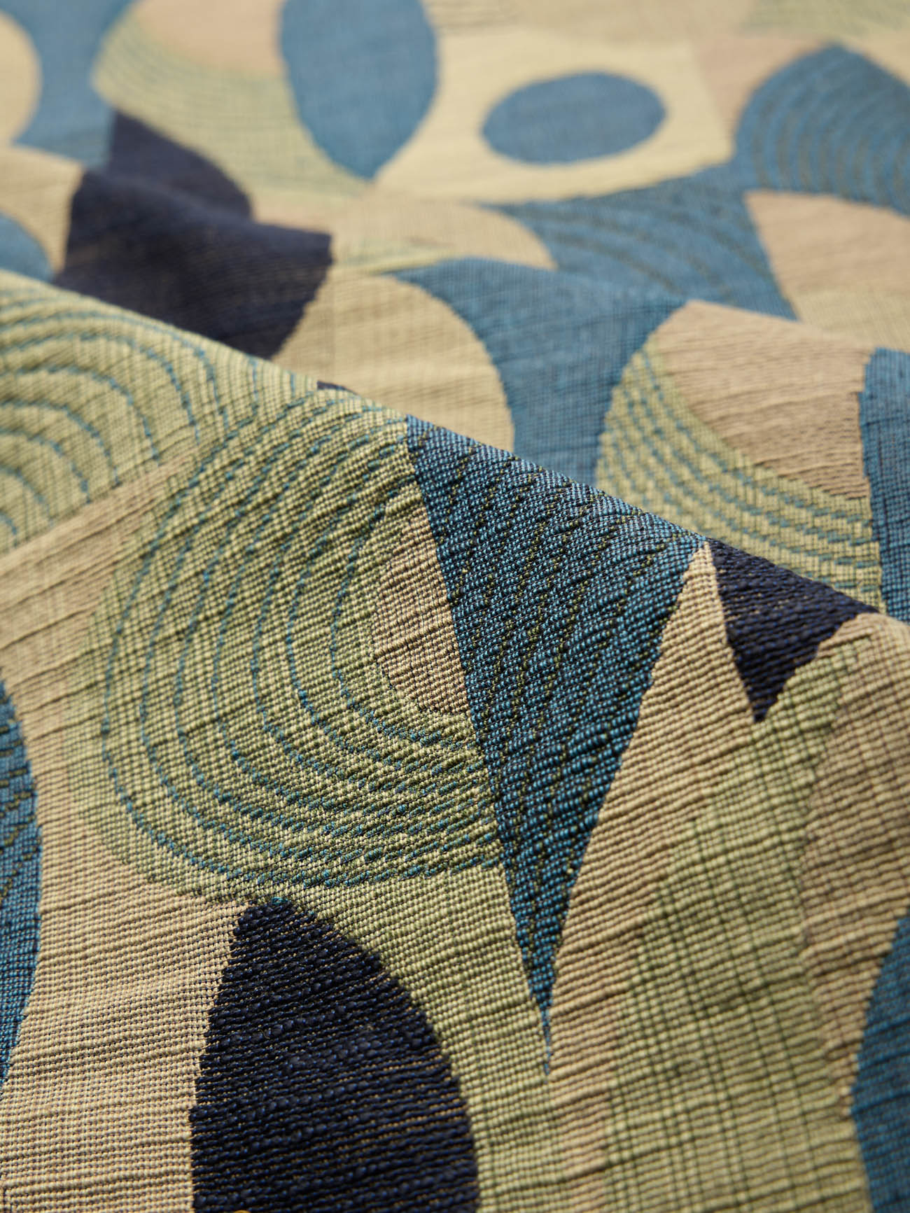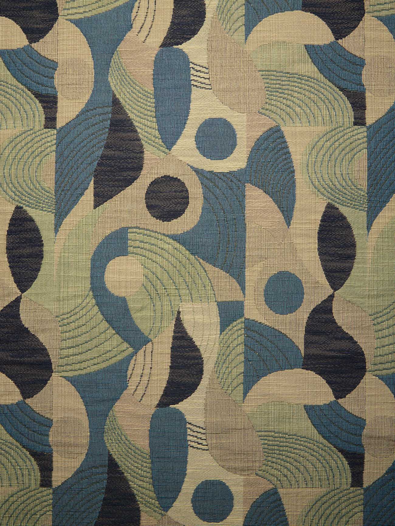 A jacquard gobelin geometry defines BIRDIE through a sequence of rounded woven shapes arranged in a vertical order. The pattern reads with continuity across the width, where curved forms introduce movement and a playful shift in rhythm. Fine, closely set colored warp yarns carry the drawing of the pattern, while a thicker, softly slubbed weft crosses the structure. The contrast between warp and weft brings variation to the weave and softens the edges of the geometry. Woven in pure cotton, the fabric has a full hand and a composed body. It lends itself naturally to seating, cushions, interior accessories, decorative wall panels, and headboards, where its structure and relief come forward with clarity. The palette unfolds through three variants. A green variant combines sage, loden, and mineral green with warm sand and clay grounds, anchored by charcoal accents. A warm variant blends sand, clay, rust, and ochre with cocoa brown, pale limestone, and soft gray. A blue variant pairs mineral blue and deep navy with light stone bases.