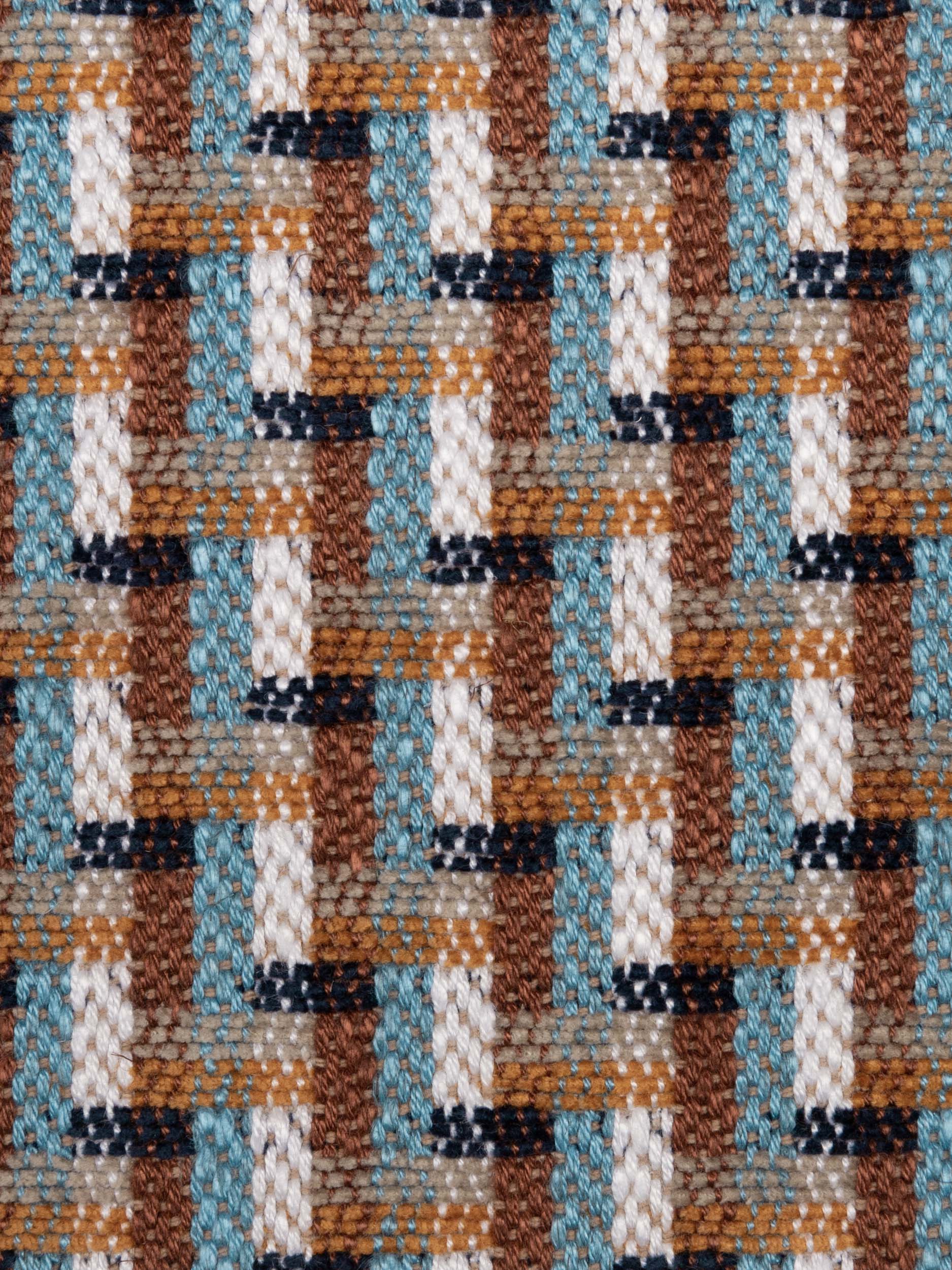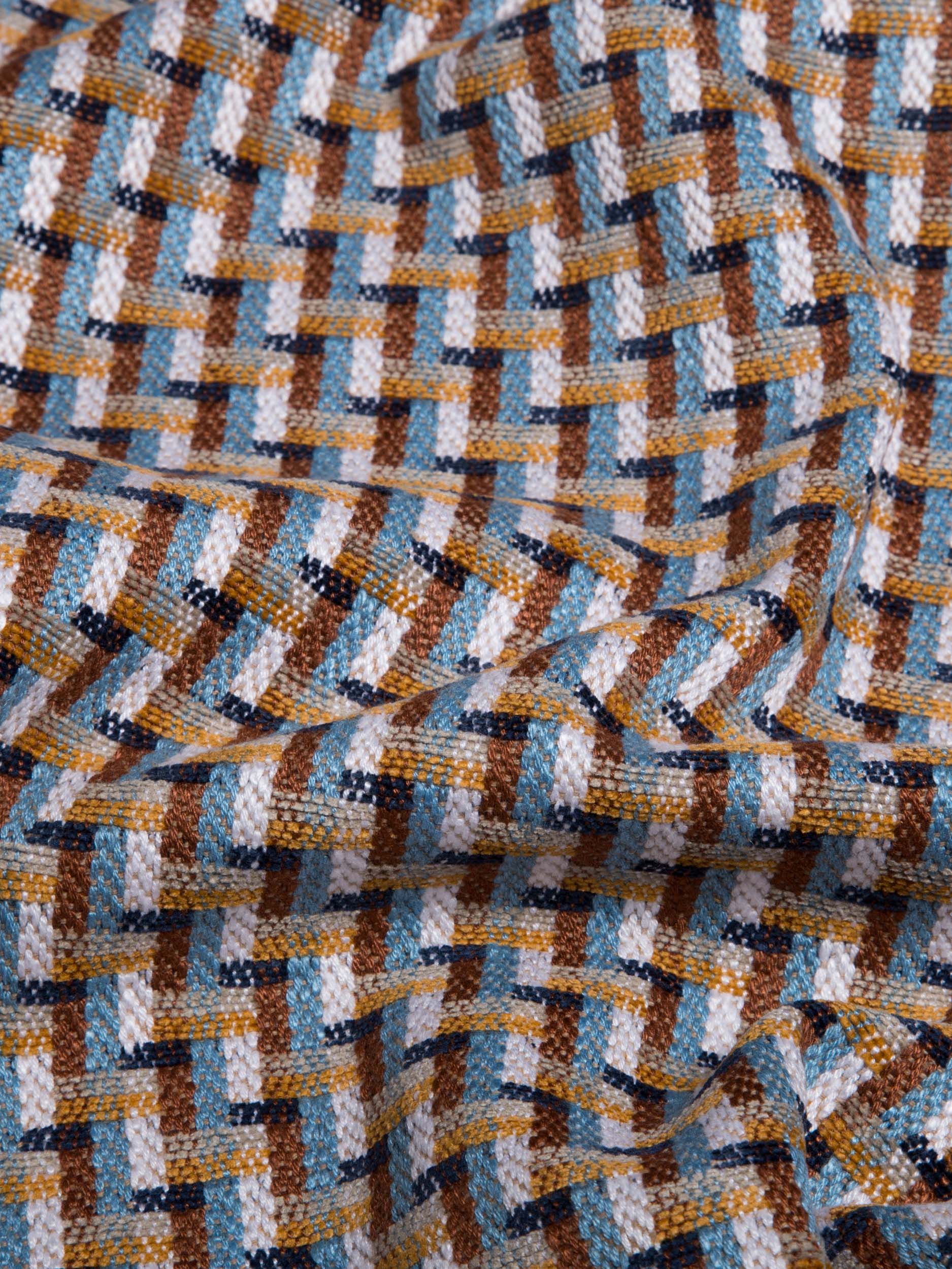A jacquard weave evokes the labyrinth, an archetypal motif of textile art in a fabric that combines materiality and colour. Suitable for all interior environments, it brings a refined but lively twist to furnishings, inspired by the world of accessories. Chunky chenille yarns intertwine with other more natural fibers creating a delicate contrast between shiny and opaque.
