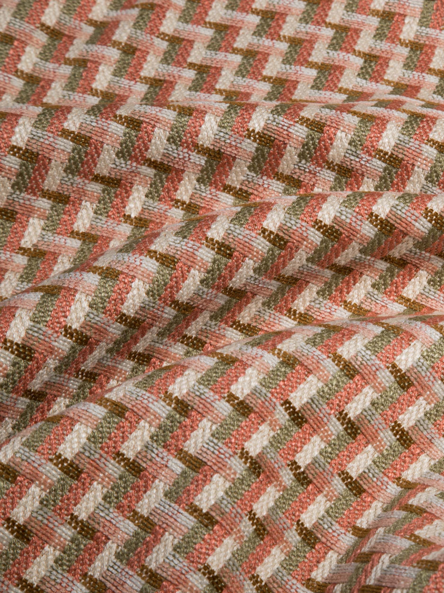 A jacquard weave evokes the labyrinth, an archetypal motif of textile art in a fabric that combines materiality and colour. Suitable for all interior environments, it brings a refined but lively twist to furnishings, inspired by the world of accessories. Chunky chenille yarns intertwine with other more natural fibers creating a delicate contrast between shiny and opaque.